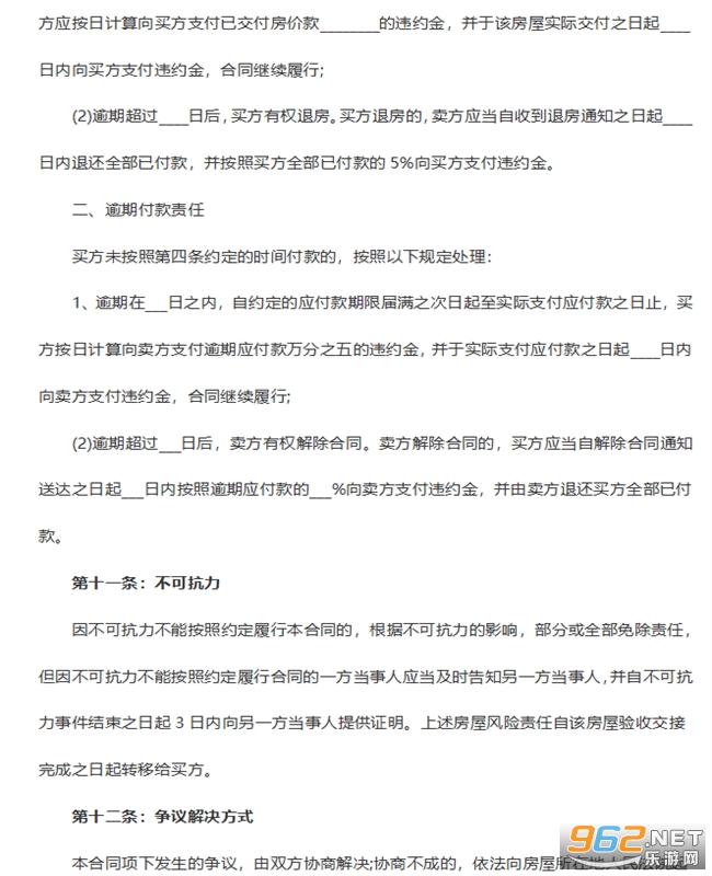 第九条:乙方全部或一部分不履行本合同约定的日期给付房价款时,其逾期部分,乙方应加付按日______‰计算的违约金给与甲方。逾期超过______个月时,甲方有权解除本合同。