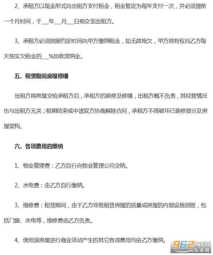 3、维修费:租赁期间,由于乙方导致租赁房屋的质量或房屋的内部设施损毁,包括门窗、水电等,维修费由乙方负责。