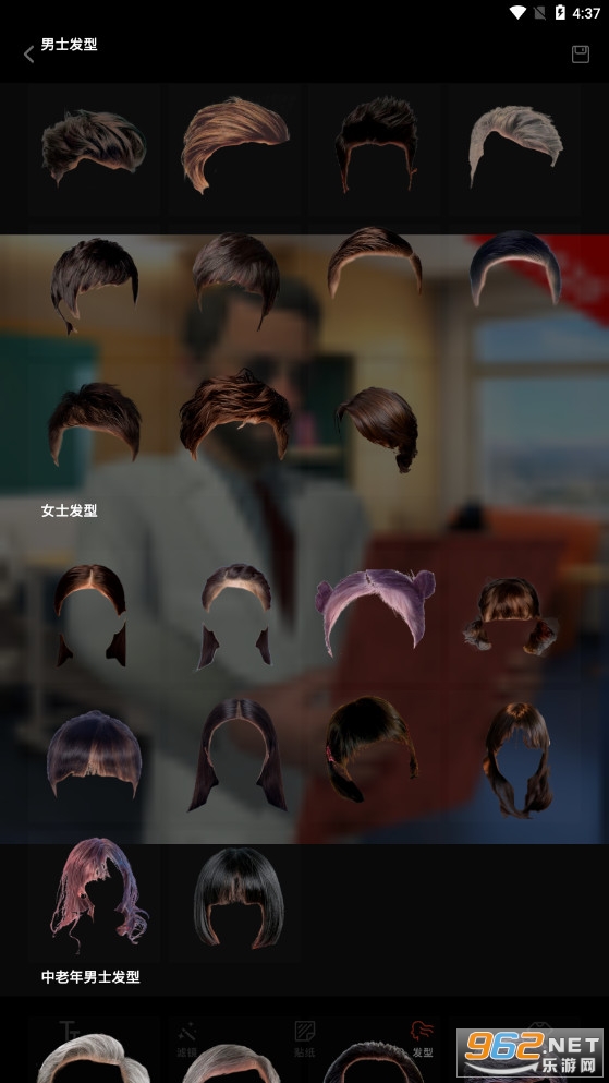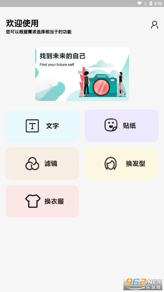 3.首页提供了文字、贴纸和换衣服等特效玩法,你可以给未来的自己做一个造型,利用系统为你提供的所有装饰。