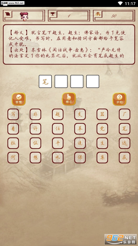 行走的成语库,随时联系,点开即玩。古风古韵的游戏界面,清新护眼的风格。