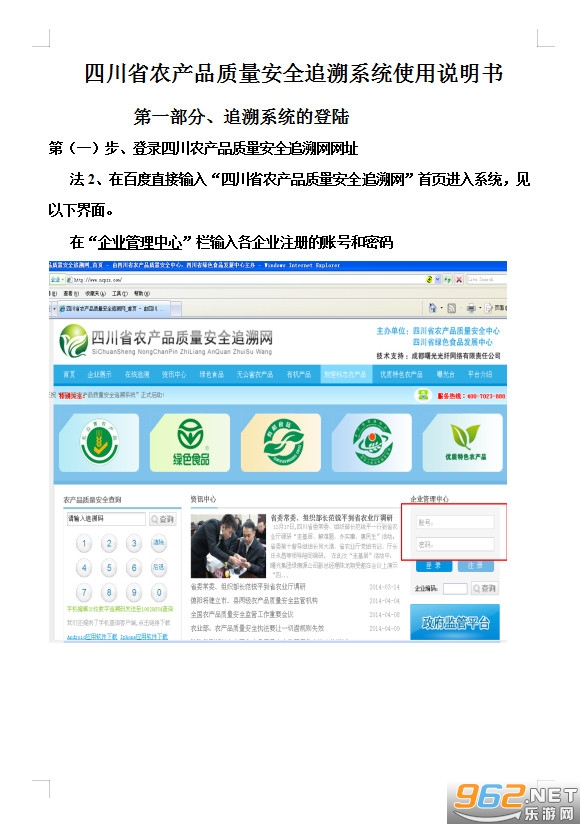 《四川省农产品质量安全追溯系统使用说明书》是一套为朋友们制作的四川省农产品质量安全追溯系统详细操作方法的文档,朋友们可以通过文档来更好的了解相关的使用方法,比如登录四川省农产品质量安全追溯网站,注册登录账号,录入信息等,有着详细的图文教程。