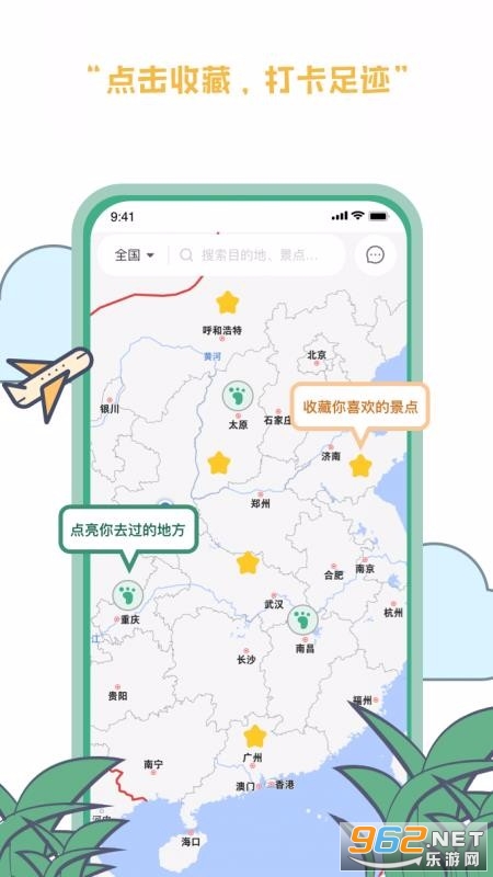 2、主要为线路旅途版旅游地图,包括但不限于地图范围选择、地点信息、地点收藏、足迹打卡等功能。