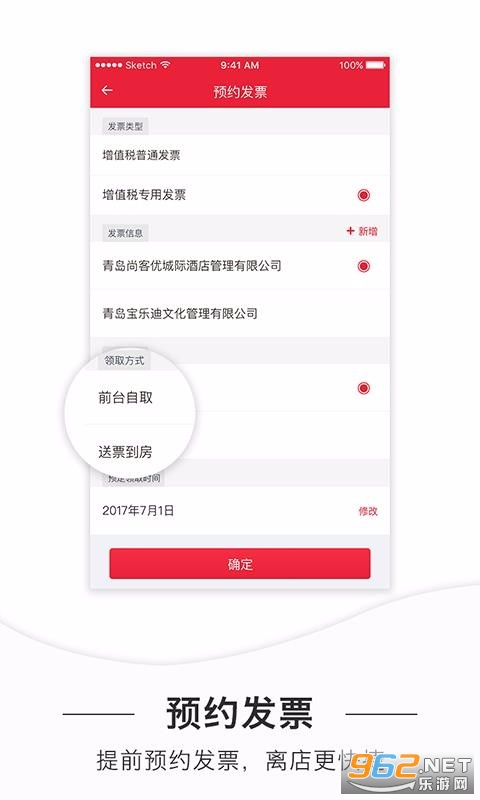 5、选择发票的信息并一键预约发票,便于在离店时获取发票,提高离店的效率;