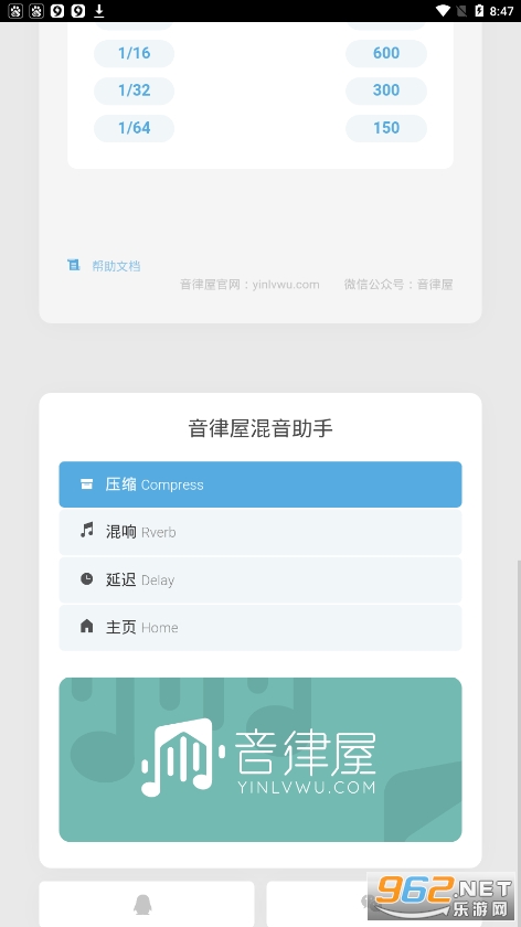 《音律屋混音助手app》是音律屋的配套软件,音律屋是一款非常好用的音乐制作教学平台,爱好音乐的朋友可以在这里自由的学习不同的音乐课程,提高自己的音乐涵养,还能在这里自由的制作作品,和其他的朋友分享,音律屋混音助手app能够为大家提供压缩,混响,延迟三大板块的功能,让你的音乐更美妙!