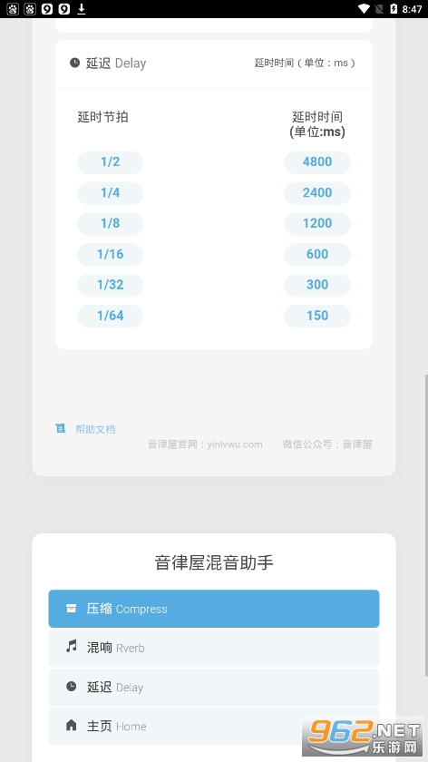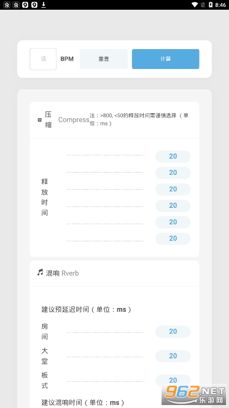 这是全网首款既有网页版又有APP版且电脑手机都匹配的混音计算助手。它主要分了三大块,压缩、混响和延迟。