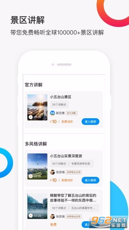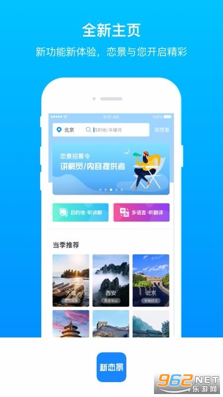 新恋景是一款一站式的旅游服务平台,涵盖旅游活动中的吃住行、游购娱所有资源需求服务,设置了一键预约的快捷功能;根据一年中不同的季节推荐非常适合该季节去旅行的各种美景资源,从这些推荐的景点中能清晰看到著名景点中的照片资源内容,可以点击进入景点详情中查看相应的美景采集图片,根据自己的喜好选择喜欢的目的地出游;应用上面设置了目的地听讲解的各种服务内容,支持在线收听旅游目的地景区的讲解音频,在目的地旅游的时候可以一边欣赏美景一边收听其中的景点讲解,有了它后就不需要请导游为自己讲解景区信息了。
