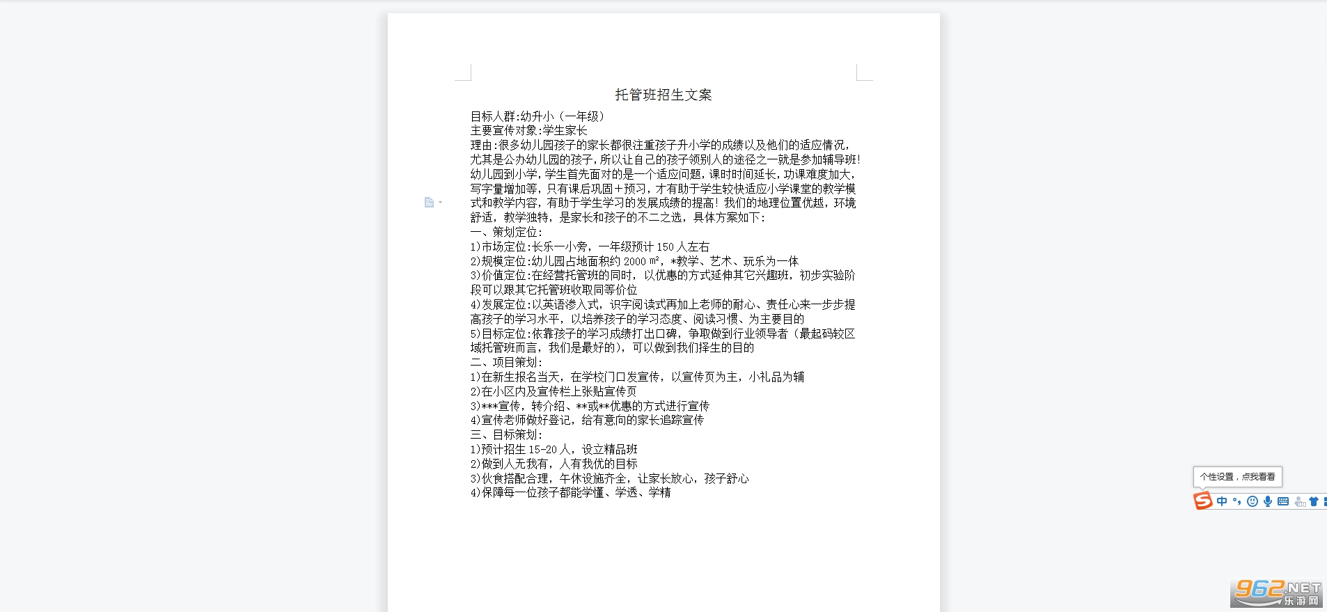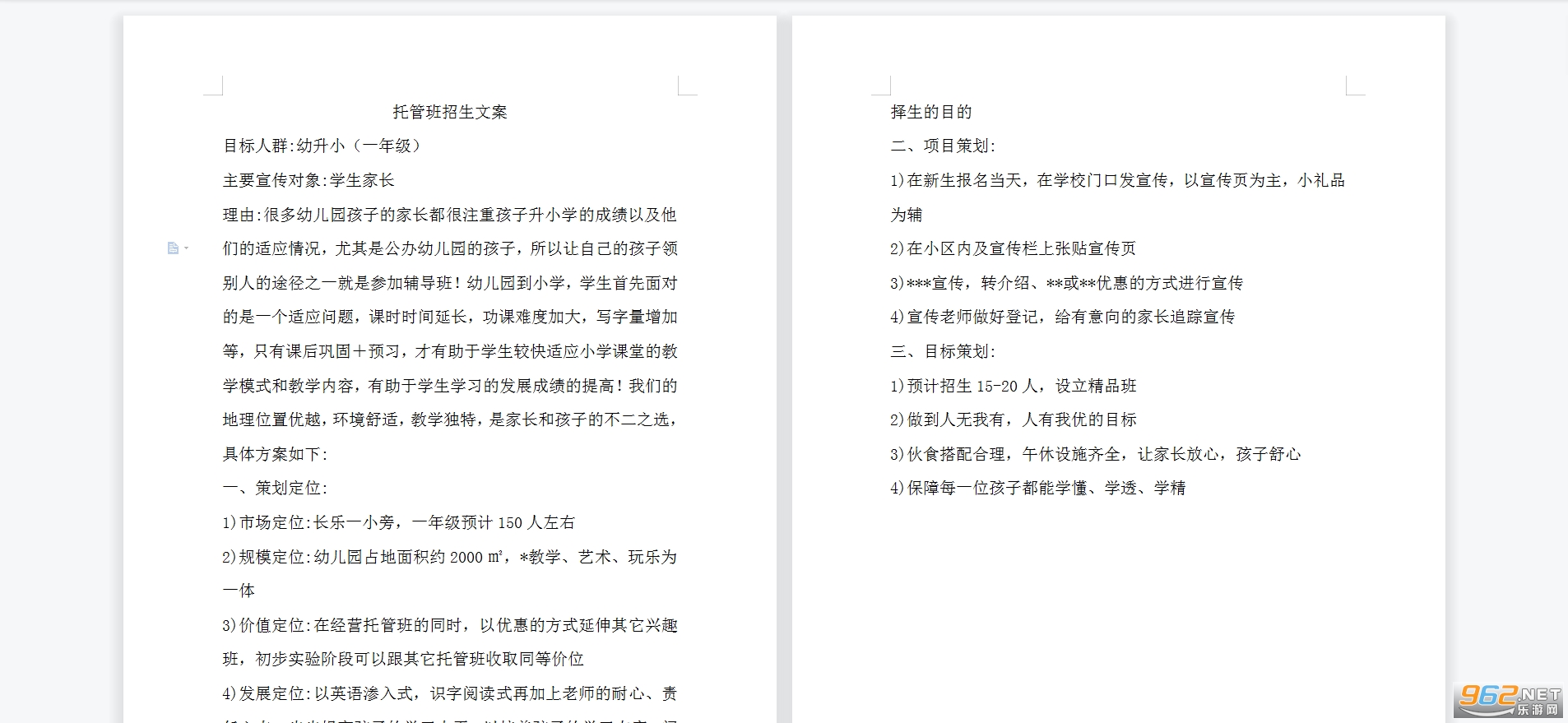 1)市场定位:长乐一小旁,一年级预计150人左右