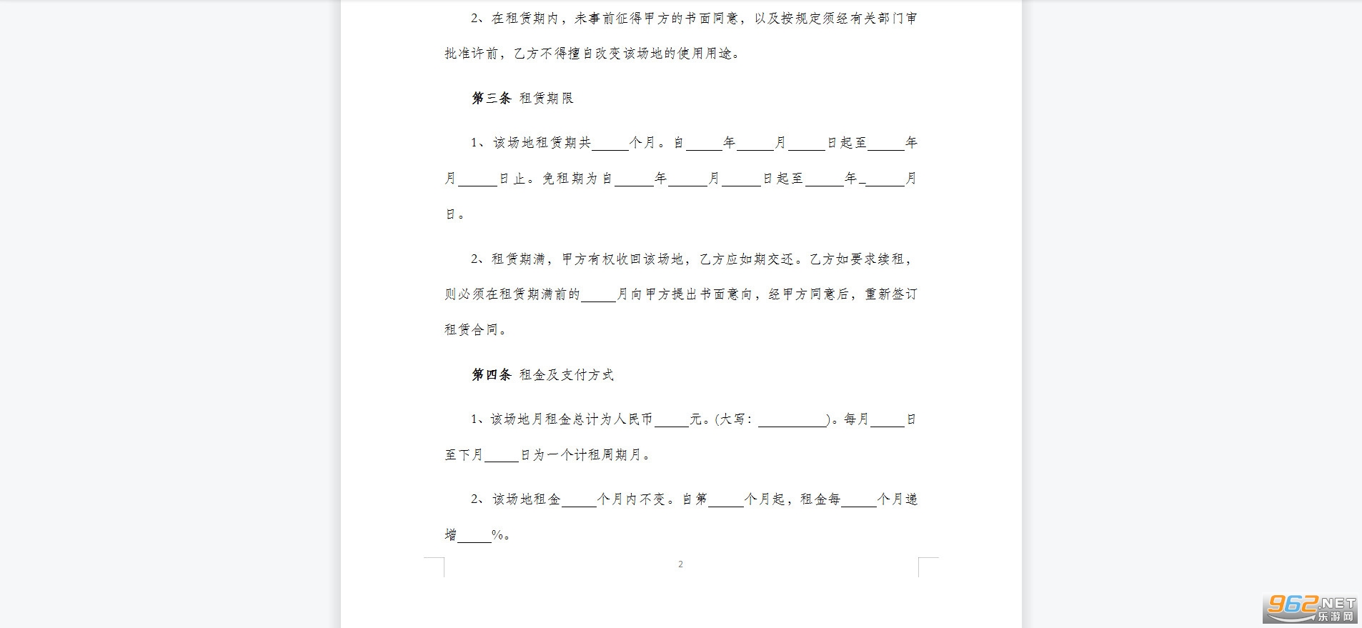 2、租赁期满,甲方有权收回该场地,乙方应如期交还。乙方如要求续租,则必须在租赁期满前的 月向甲方提出书面意向,经甲方同意后,重新签订租赁合同。