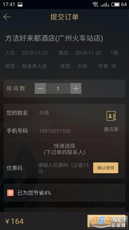 5、用户在订单确认页面,可以通过通讯录快速的选择联系人,并输入优惠码进行支付;