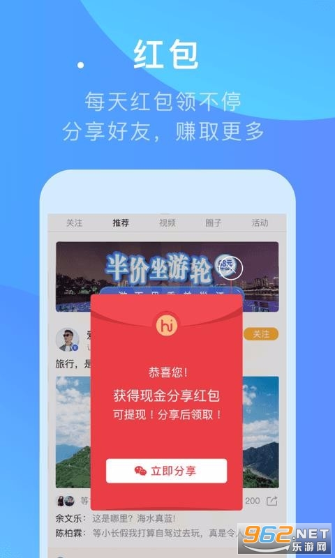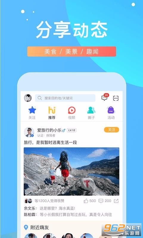 一款旅行资讯、社交APP,提供各种旅行活动、周边游、旅游线路,生活、旅行动态分享,欣赏美景趣闻、发现更多美食,商家入驻,交友互动,体验生活新姿态。