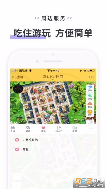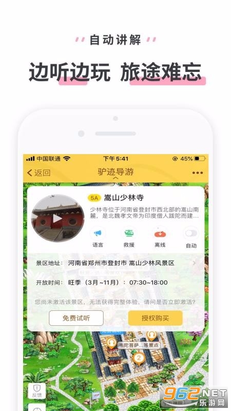 《嵩山少林寺app》是一款全新上线的手机旅游app,这里为用户提供最好的旅游攻略,针对少林寺的一些景点进行讲解,同时该软件也为你规划了游玩的路线,比如第一站应该去的位置,以及该位置可以游览或玩耍的方面,欢迎来962下载体验试试吧!