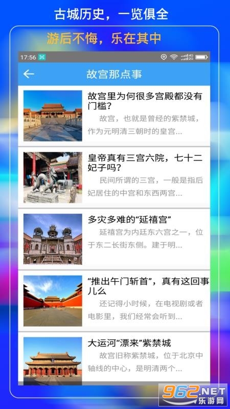 《故宫云导游手机版》是一款智能云导游软件,不但安装方式方法非常简单,而且不需要任何费用,通过这款软件可以通过定位来了解当前地点的历史背景故事,让你轻松游玩故宫,感兴趣的朋友还在等什么?欢迎来962下载体验试试吧!