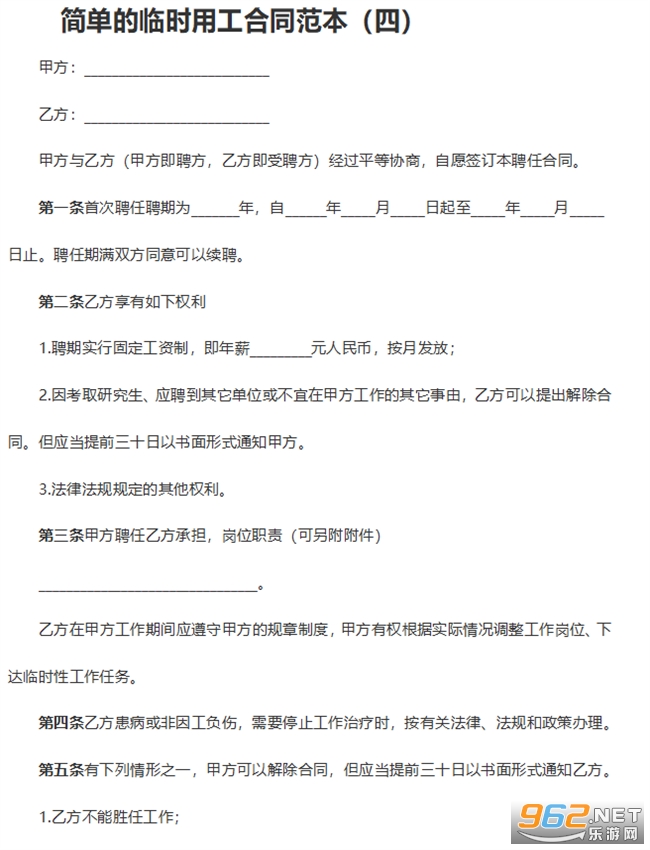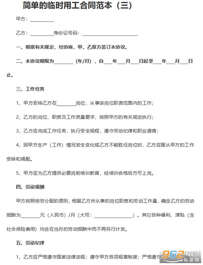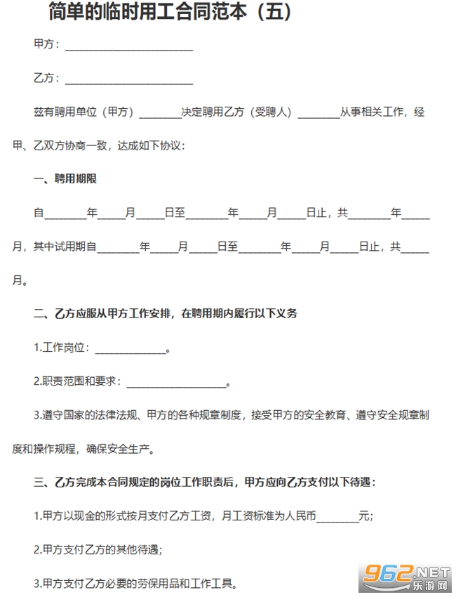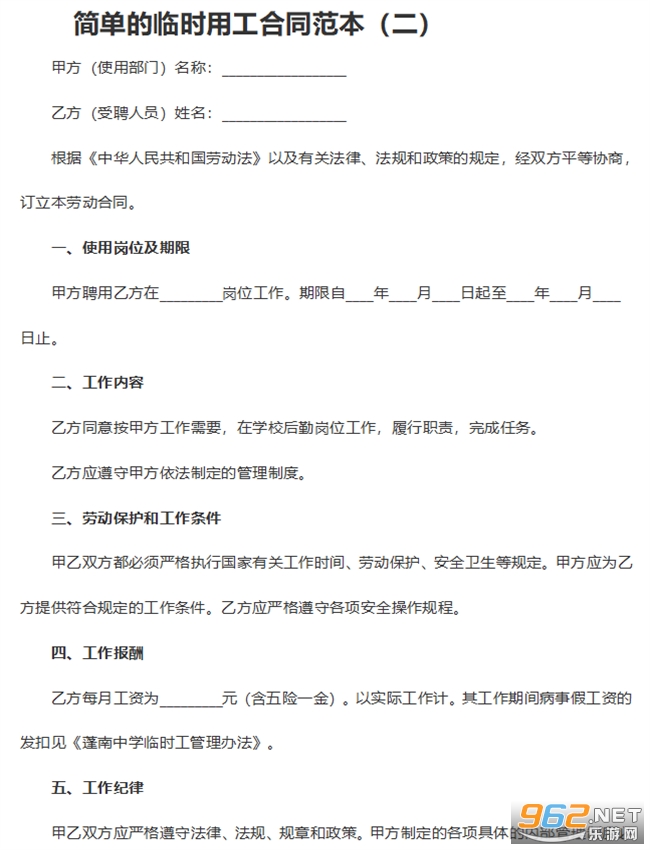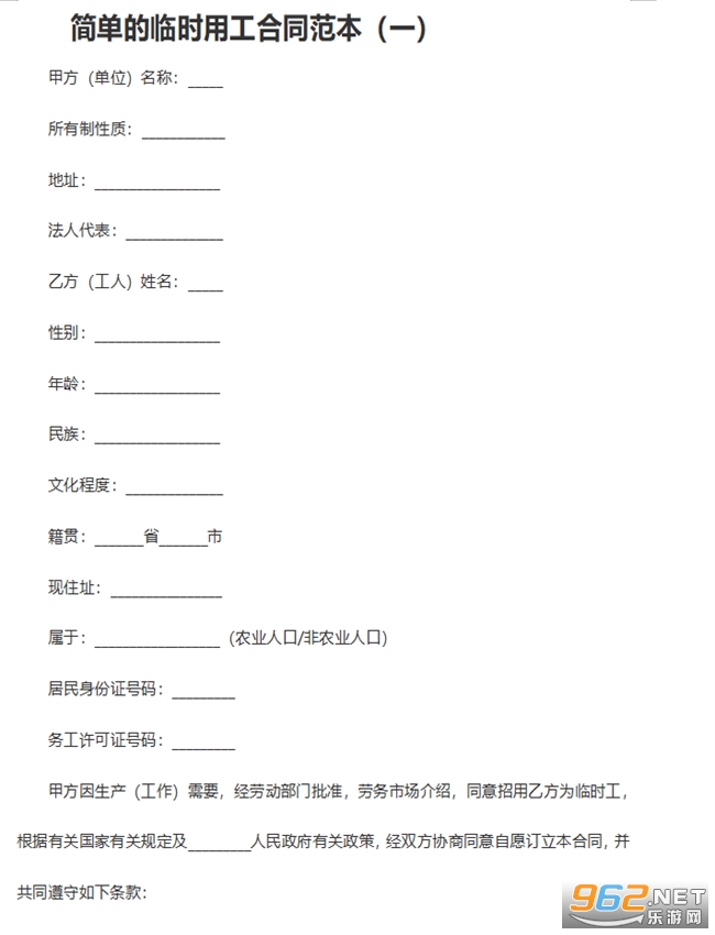 甲方因生产(工作)需要,经劳动部门批准,劳务市场介绍,同意招用乙方为临时工,根据有关国家有关规定及_________人民政府有关政策,经双方协商同意自愿订立本合同,并共同遵守如下条款:
