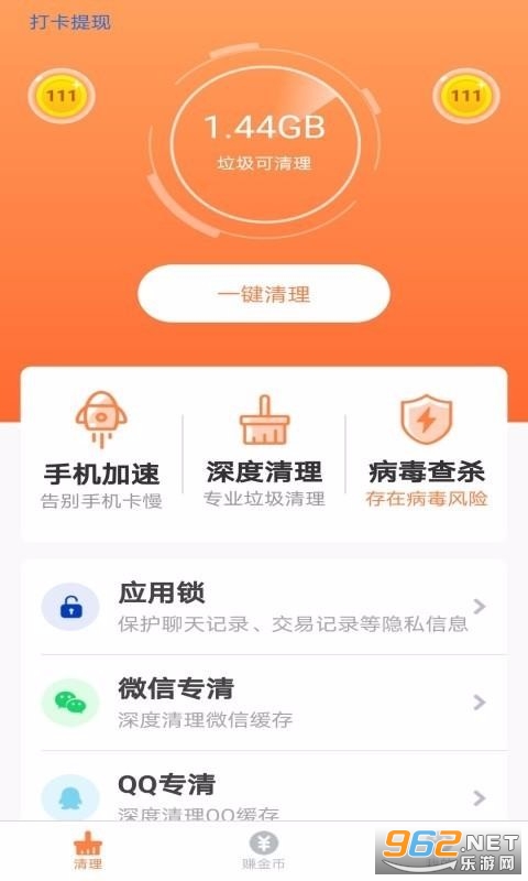 一款简单方便的手机垃圾清理软件,让垃圾清理更便捷,给你更好的清理服务;让清理更方便;将扫描的垃圾一键快速清理,便于管理,提高手机的运行速度,便于管理;对手机进行加速管理,让加速更方便,提高加速的效率,减少卡顿的时间;对手机进行专业的病毒查杀,便于管理,知道手机的风险问题,并快速处理病毒,提高病毒清理的效率;专业的应用锁让你知道应用的情况,便于保护个人的隐私,提高管理的质量;详细的记录签到的信息,并对获取的金币进行提现,便于管理个人财产,提高提现的效率;还有省电服务,让你的省电更便捷,并修复电池问题。