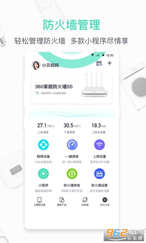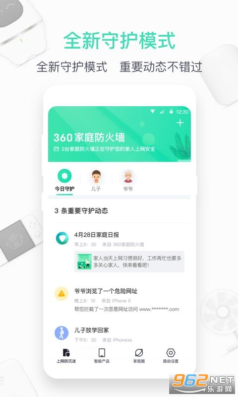 《360家庭防火墙APP》是一款非常给力的系统防护软件,操作非常简单,安装也方便,智能硬件防入侵、查看上网报告等功能,为家人营造绿色健康的上网环境。而且还是免费的,操作也简单,感兴趣的朋友欢迎来962下载吧!