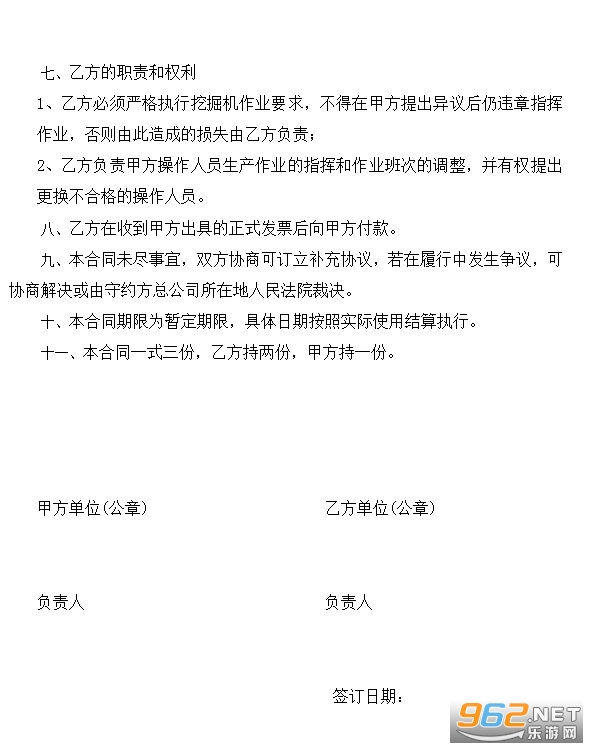 6、甲方操作人员,必须遵守安全操作规程,确保安全生产,发现不安全隐患有权停止作业,并有责任及时通知乙方共同采取措施,挖掘机出现故障时,甲方须迅速组织人员进行现场抢修,及时排除,以保证乙方生产使用;