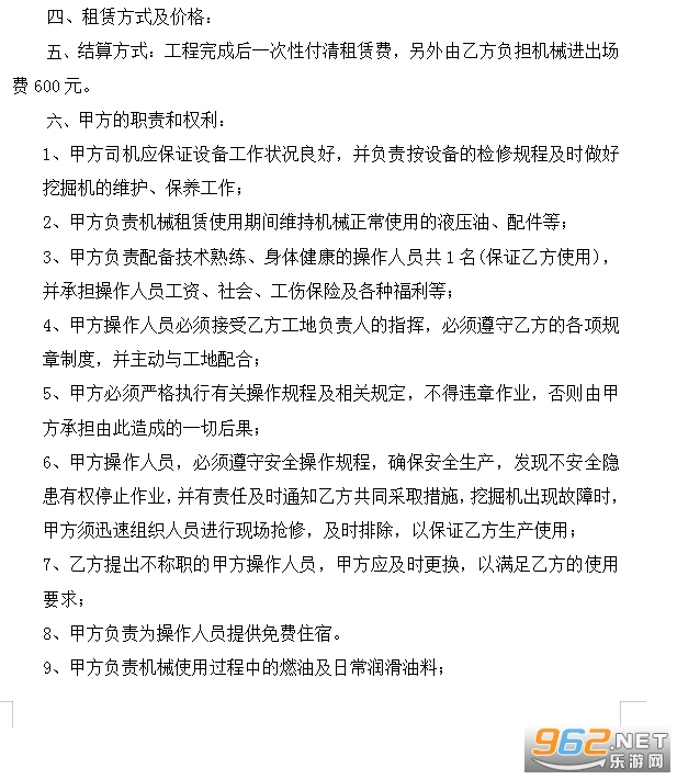 五、结算方式:工程完成后一次性付清租赁费,另外由乙方负担机械进出场费600元。