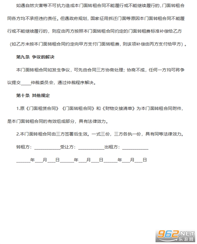 2.本门面转租合同由三方签署后生效。一式三份,三方各执一份,具有同等法律效力。