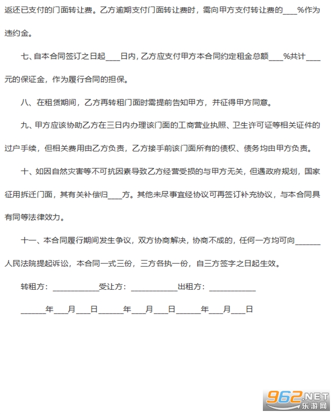 六、甲方保证该门面有合法承租权并有权依法转让,并及时交付门面,甲方逾期交付门面时,需向乙方支付转让费的____%作为违约金,超过___天甲方仍不交付转让门面时,乙方有权通知甲方解除合同,返还已支付的转让费和按上述约定追偿违约金。乙方应按时接收门面和支付门面转让费。乙方逾期接收门面超过____天时,甲方有权通知乙方解除合同,不予返还已支付的门面转让费。乙方逾期支付门面转让费时,需向甲方支付转让费的____%作为违约金。