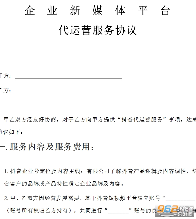 《新媒体平台代运营合同范本》是值得网络新媒体的代运营的服务协议,类似抖音等等都是可以进行使用的,带来的是word版本的,可以自由进行修改,主要拥有企业版本的,下载格式是rar压缩包,感兴趣的亲们赶紧下载吧。