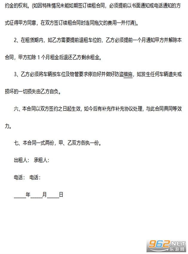 1、乙方在租赁期内必须按合同条款的规定按时缴付车位租金;如乙方拖欠租金达一周,即被视为是自行解除本合同行为,甲方有权将该车位收回,并保留向乙方追收拖欠费用和违约金的权利。(如因特殊情况未能如期签订续租合同,必须提前以书面通知或电话通知的方式征得甲方同意,在双方签订续租合同时连同拖欠的费用一并付清)。