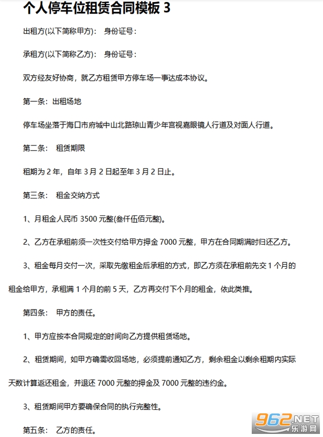 3、甲方所出租的场地,仅供乙方作停泊车辆使用,不作任何保管;如乙方所停泊的车辆有任何损失或被人为损坏的,一切后果由乙方自负。