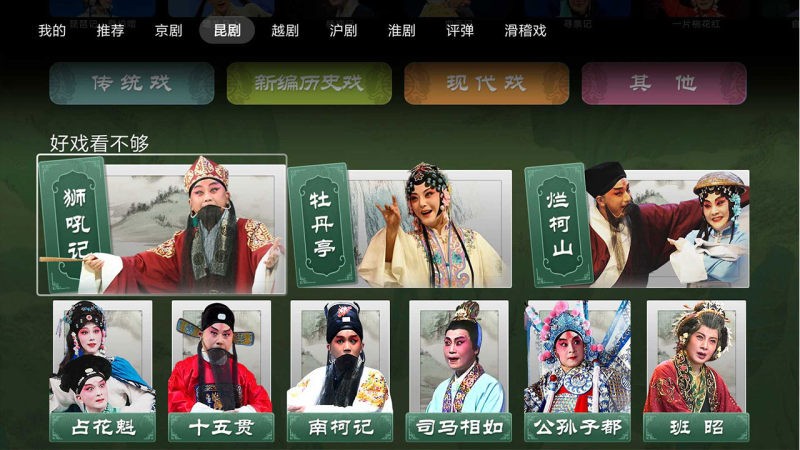 囊括京剧、昆剧、越剧、沪剧等多种剧种,涵盖经典名段、大师名家、最新演出等丰富内容,让您随时随地,想看就看。
