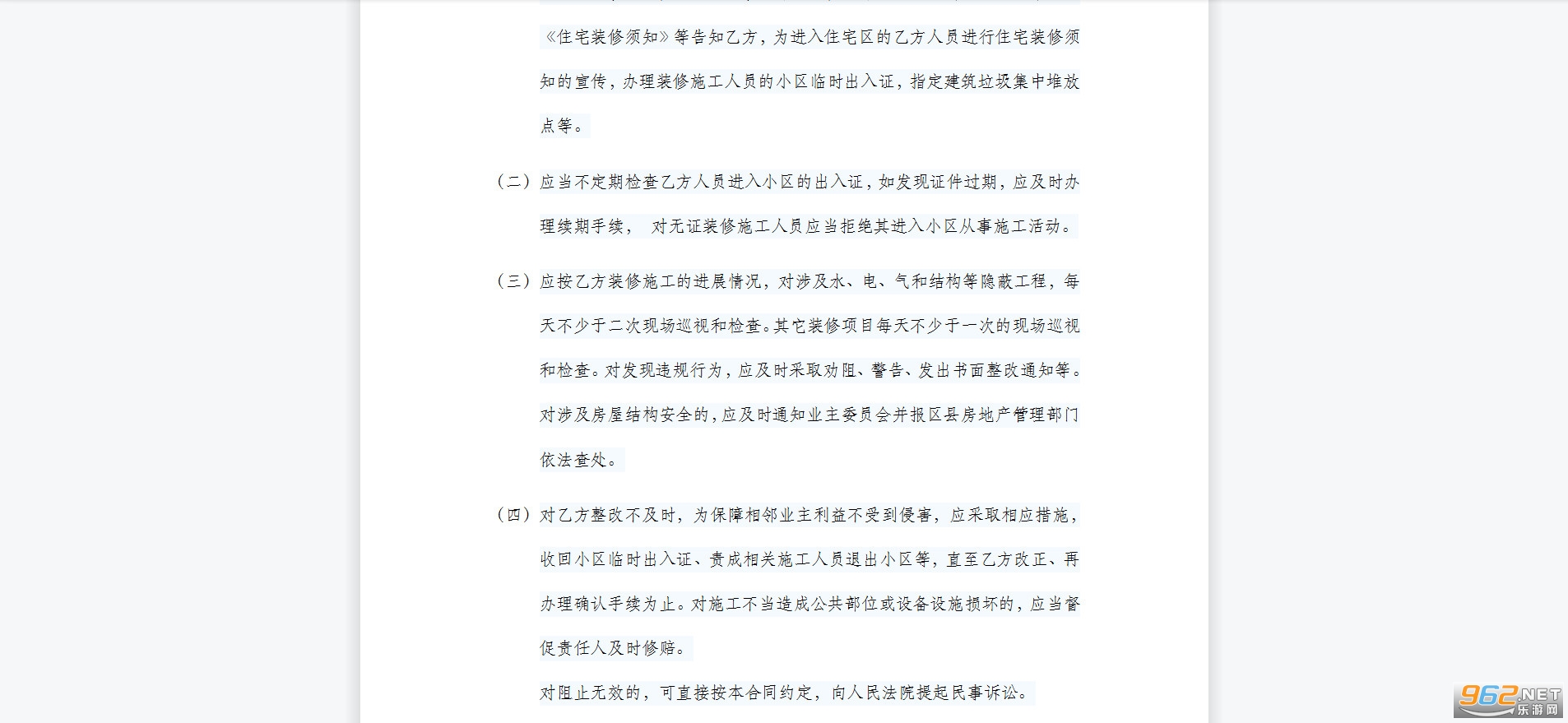 第三条 乙方应严格遵守本市有关法规、《住宅装修须知》,接受甲方组织的宣传,与甲方签订《住宅装修管理合同》,办理住宅小区临时出入证、住宅装修施工告示牌等方可开始施工。