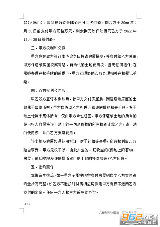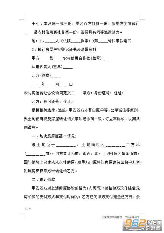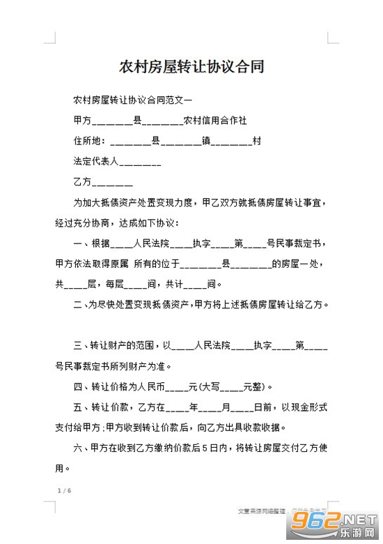 《农村房屋转让合同协议书范本》是一套为朋友们制作的房屋转让协议书样板,一些朋友想让转让自己的房子给其他人,用来卖钱或者抵债等,需要签订合同来保护双方的权益,比如房屋面积、转让价格等都需要写清楚,小编整理了一份农村房屋转让合同模板,可以参考借鉴下。