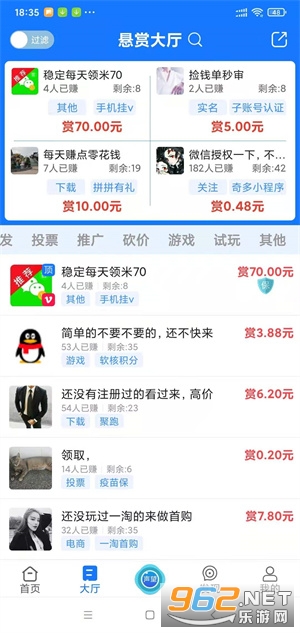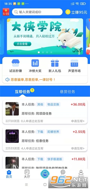 互帮侠-是一款类似众人帮、趣闲赚的做悬赏任务赚钱APP,是由北京聚量引擎科技有限公司推出,在这里可以免费接单赚钱、发布信息、发布任务和体验平台多样服务。互帮侠app下载安装就有新人好礼,完成相应数量的悬赏任务即可领取额外的现金奖励,平台内的任务丰富多样,包括下载、注册、实名、电商、关注、转发、投票、推广、砍价、游戏、试玩等等,另外还有声望称号玩法,激活后每天都能领分红,感兴趣的朋友快来下载互帮侠试试吧!