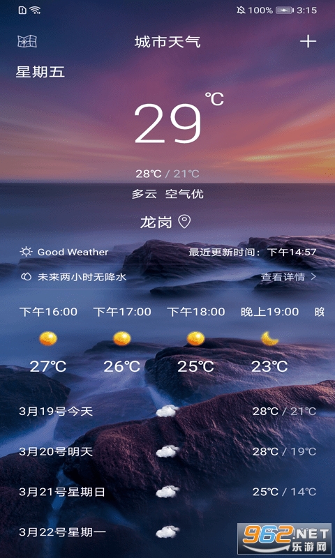 帮助大家实时掌握24小时天气变化情况,根据天气安排自己的出行,这上面的预报非常准确,一般在一周之内误差是非常小id,并且软件安装包很小,不会占你手机的运行内存。