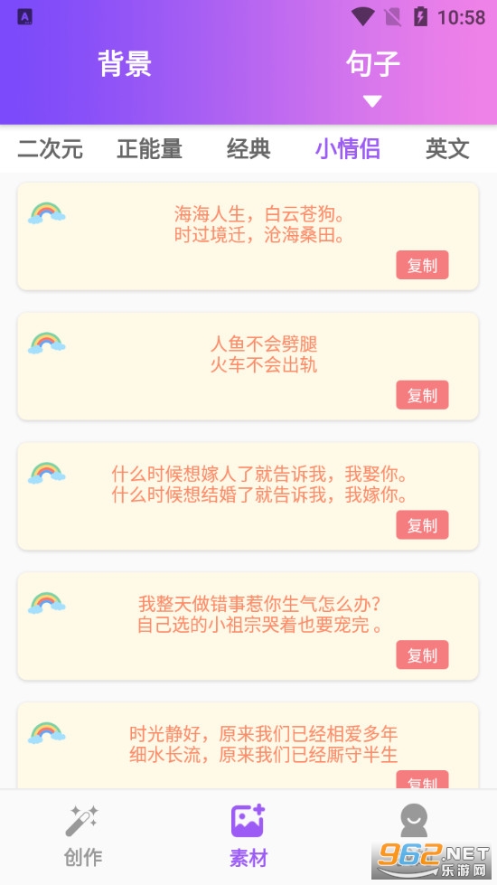 照片加文字中有超丰富的文字库,包含了多种系列文案,伤感系列、幸福系列、正能量系列、情侣系列,英文系列等精美文案,一键复制。在自己的照片加上一种心情,就是这么有内涵!