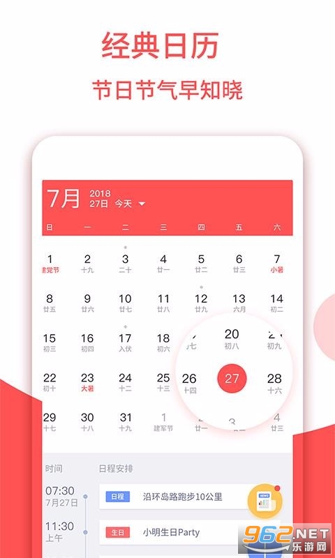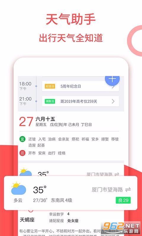 《东方农历APP》是一款非常好用的手机日历APP,这款软件的操作和安装方法都非常简单,而且不需要任何费用,操作也方便,同时它还可以作为日常生活的记事本、天气预报等,让你生活无忧,感兴趣的朋友还在等什么?欢迎来962下载体验试试吧!