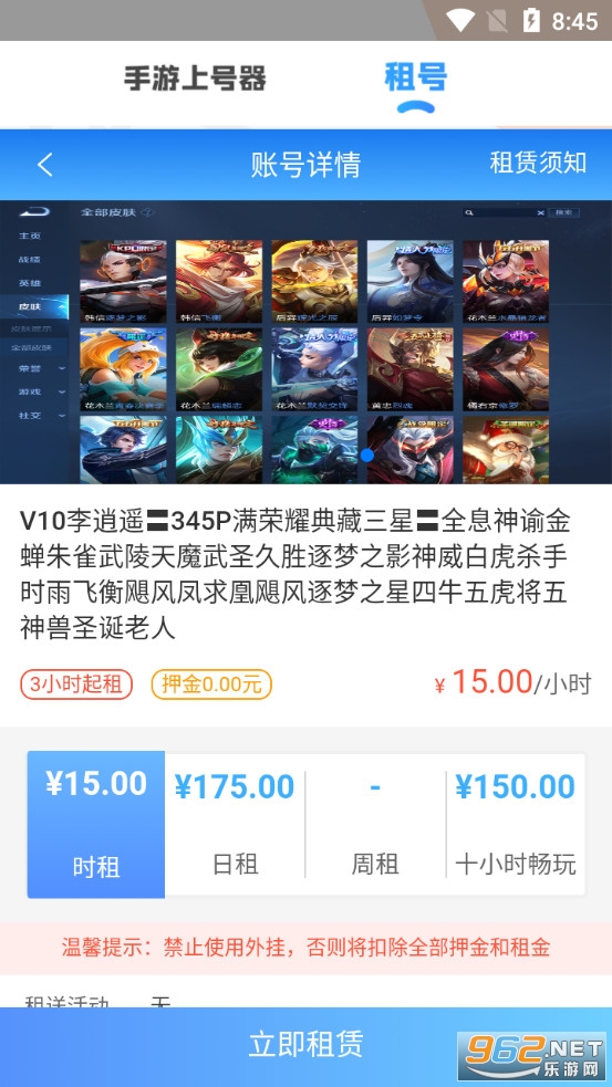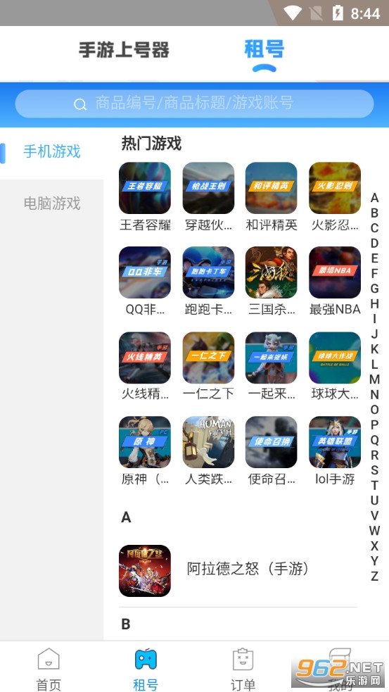 《手游租号上号器》是武汉诸相网络科技有限公司推出的一款可以供玩家租号玩的平台,手游租号上号器中有着王者荣耀、英雄联盟、穿越火线等各种热门的手机游戏和电脑游戏,可以租一小时也可以租一整天,不同的游戏不同的账号价格是不同的,可以使用本款软件利用订单号一键上号玩。