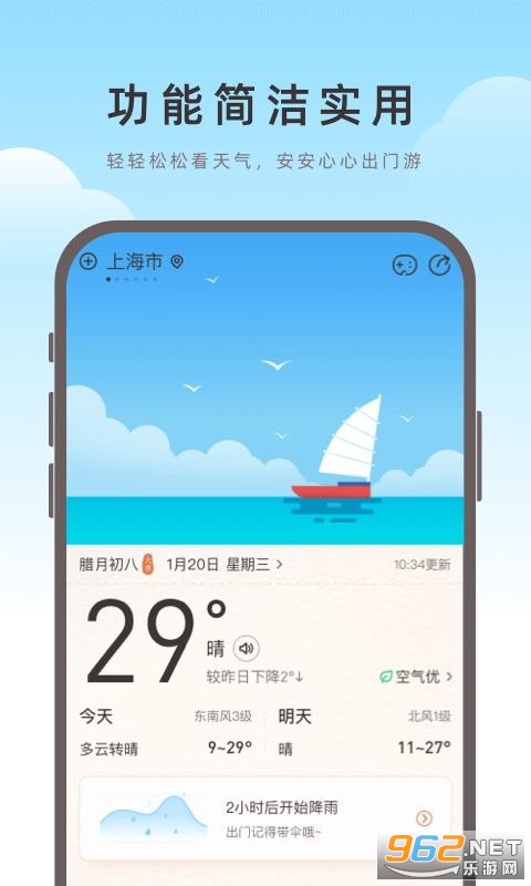 《海鸥天气官方版》是一款非常好用的手机天气预报软件,这款软件的操作和安装方法都非常简单,不需要任何费用,了解每天的最新天气,功能也强大,为你提供近15日最新的天气预报,非常精准,为你出行提供方便,感兴趣欢迎来962下载试试吧!