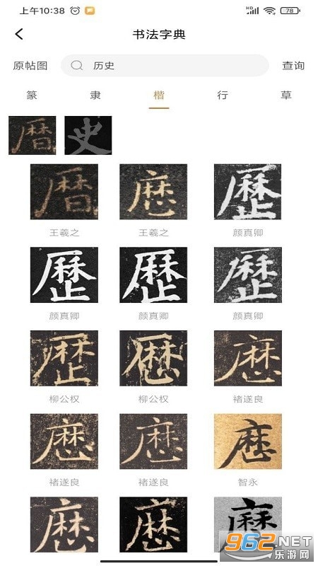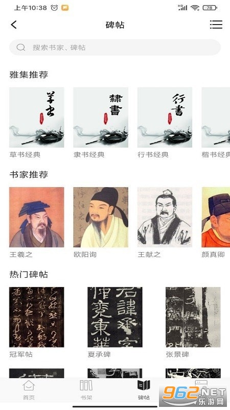 提供近万本高清碑帖便于用户学习欣赏和在线临摹,涵盖王羲之、颜真卿、柳公权、欧阳询、孙过庭、米芾等历代近千名书法大家作品,任您选择,并持续更新。