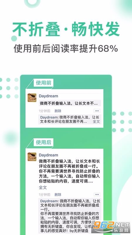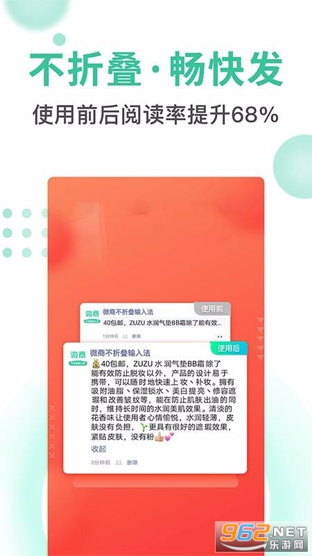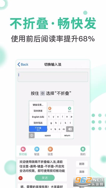 《防折叠输入法安卓版》是一款非常好用的手机输入法插件,这款软件为用户提供最好的输入法哈建,而且门槛低,操作也简单,输入法操作也简单,安装也方便,体验最为轻松的输入法功能,感兴趣的朋友还在等什么?欢迎来962下载体验试试吧!