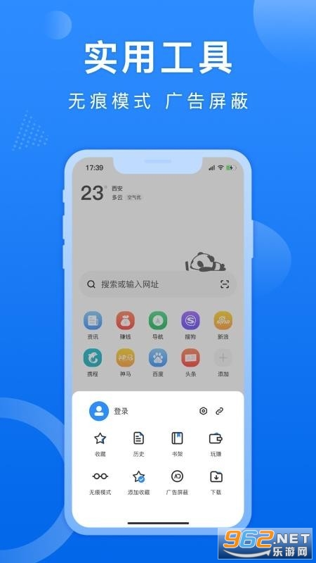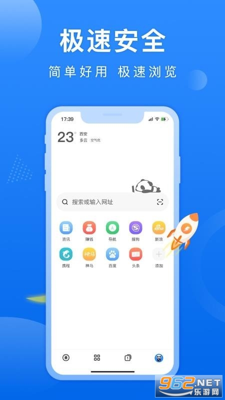 《熊猫浏览器APP》一款非常好用的手机浏览器,非常简洁的画面和清晰的关键词搜索,功能简单,安装包小,启动更快,上网更快哦,多核系统让上网更加便捷快速,用户有任何想要查找的资源都可以在线输入关键词进行搜索,轻松搞定一切问题,感兴趣欢迎来962下载吧!