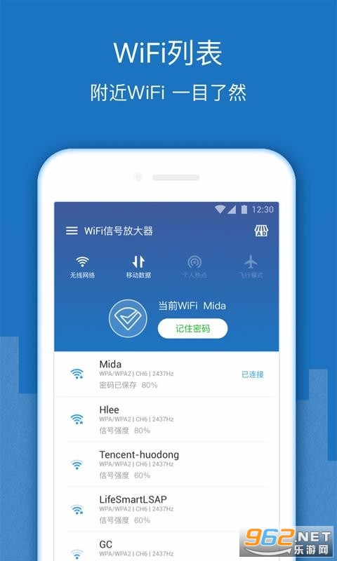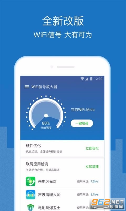《WiFi信号增强放大器app》是一款非常好用的手机wifi管家,这款软件的操作和安装都很简单,可以提高你的wifi强度和信号,让你玩游戏看电影更加流畅,感兴趣的朋友还在等什么?赶紧来962下载体验试试吧!