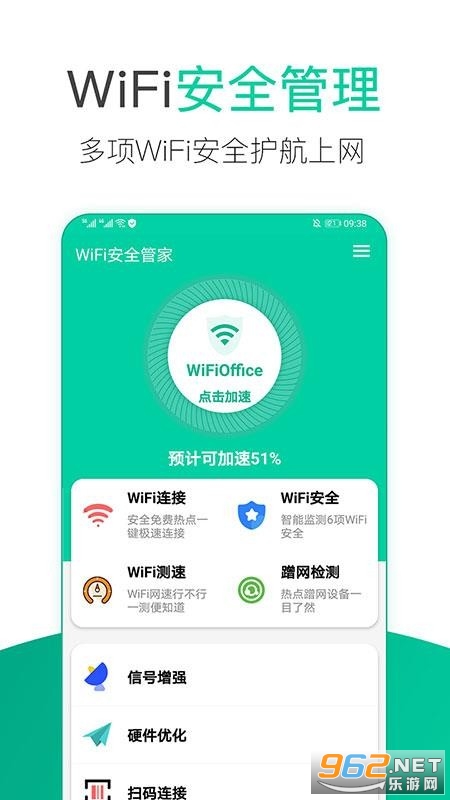 一键式免费、专业、稳定、安全并且完全手机安全与管理软件,以“手机WiFi管理”为使命,提供体检加速、健康优化、WiFi一键链接、安全防护、无需WiFi钥匙,自动识别周围无线WiFi,全新界面,