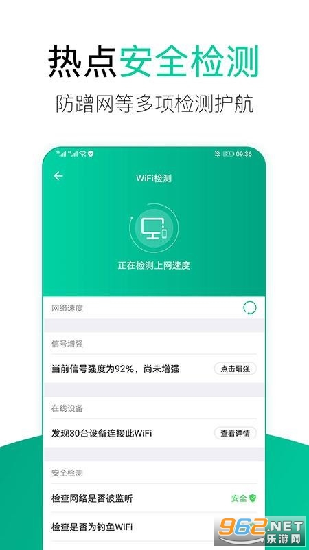 1、WiFi安全检测:检测6项网络安全,联网设备,网络速度等,护航上网安全;