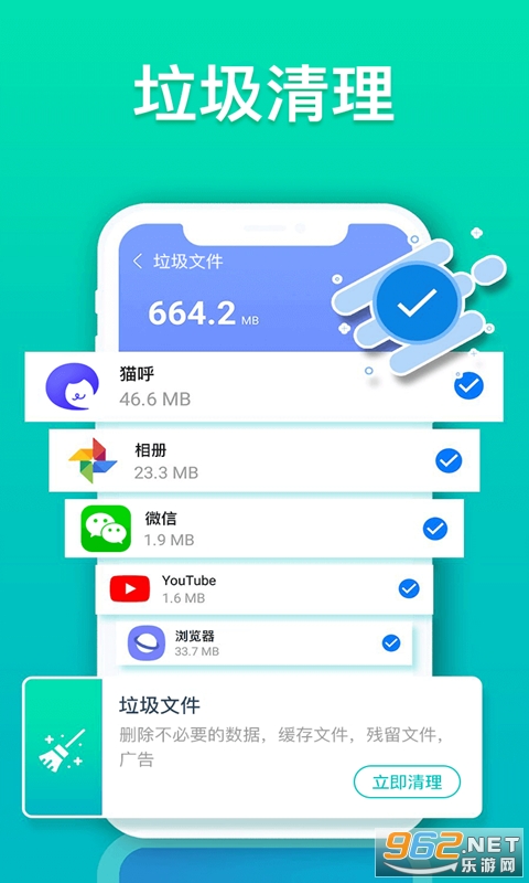 一键清理内存垃圾,节省手机空间,让你的手机在使用时不再卡顿;