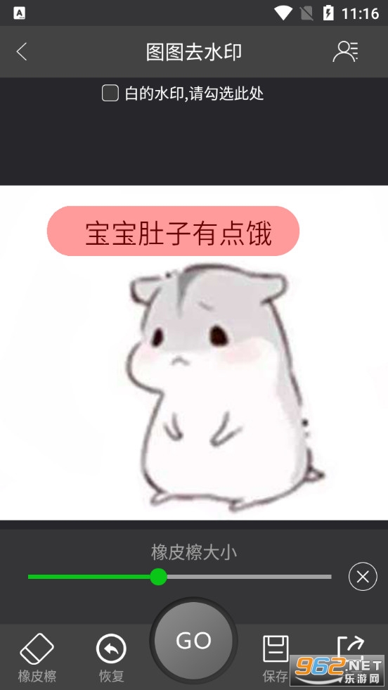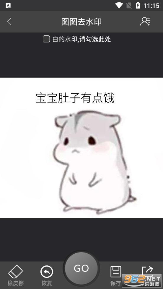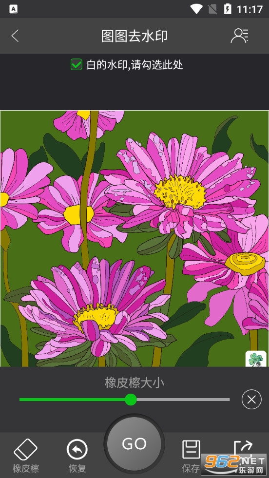 《图图去水印手机版》是厦门市迅牛信息科技有限公司推出的一款一键去除水印的软件,适合安卓手机用户使用,朋友们将需要处理的图片上传到软件,然后选择橡皮擦大小,将需要去除的地方做上标记,然后点击go就可以去除水印可以,注意只能免费试用几次。