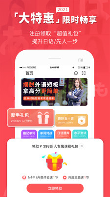 【新人福利】首次下载并注册的新用户,即可免费领取价值398元大礼包,内含一节1对1外教体验课和一节兴趣主题课。快来加入日本村,和全球小伙伴一起学日语吧!