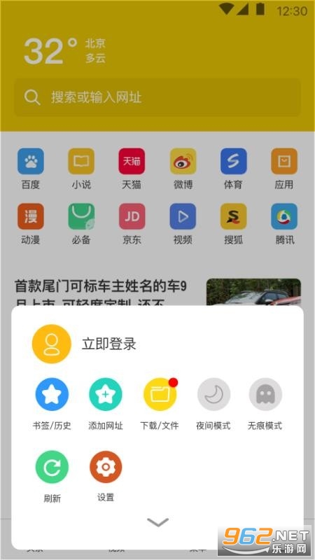 菜单:增加书签,看历史记录,夜间模式,无痕模式切换