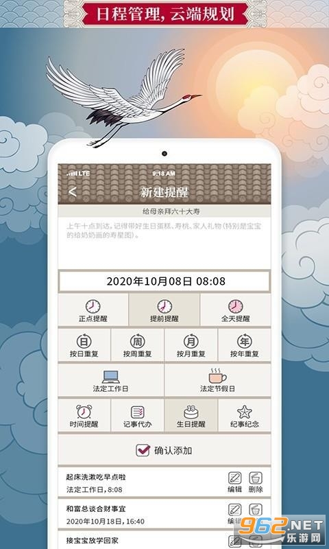 3.具备闹钟、记事、提醒功能,合理的类别划分,扁平化的时间设置(版权专利),能让用户在最少的页面达成最全面的规划,极大的丰富和提升了日程管理的功用和效率。并能把设置结果即时备份到云端,防止遗失。