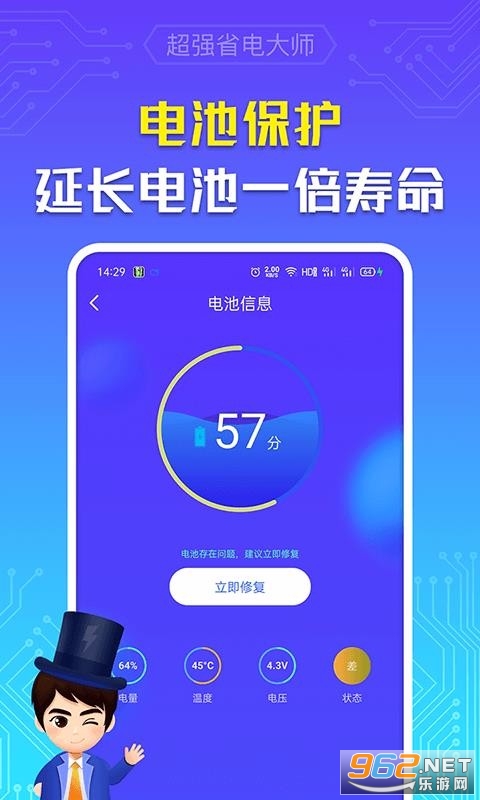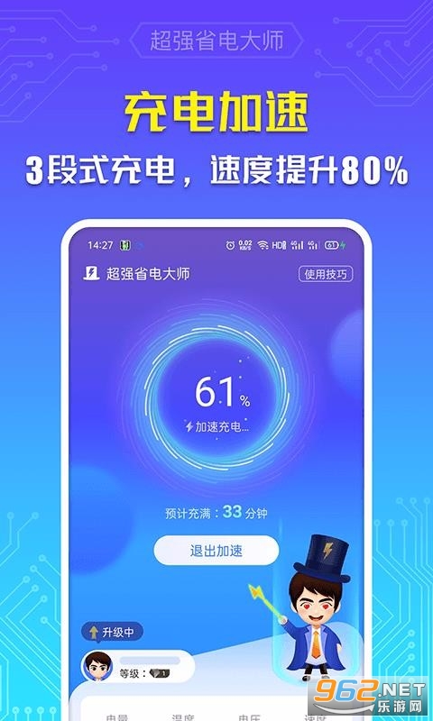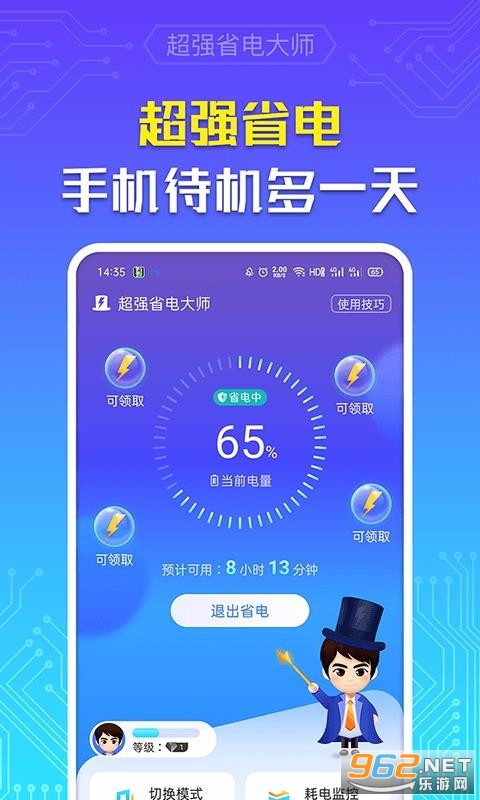 《超强省电大师app》是一款非常给力的给手机省电的软件,软件的安装方式很简单,操作也方便,实时监控电源状态,及时关闭多余耗电后台,智能省电,用户还可自动选择省电模式,随时查看手机电量情况!感兴趣的朋友欢迎来962下载试试吧!