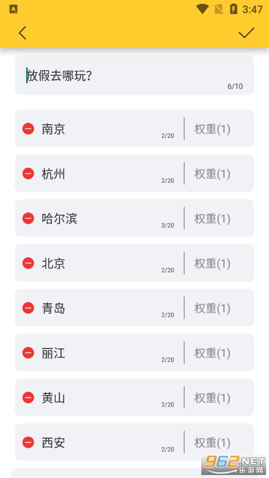 帮助朋友们做决定的工具,有些事情你拿不定注意,可以使用本款软件来帮助你,比如中午吃什么、放假去哪玩、谁来结账、谁做饭等等,都可以将各种选项做成转盘,然后来随机选择,有需要的朋友可以下载试试。