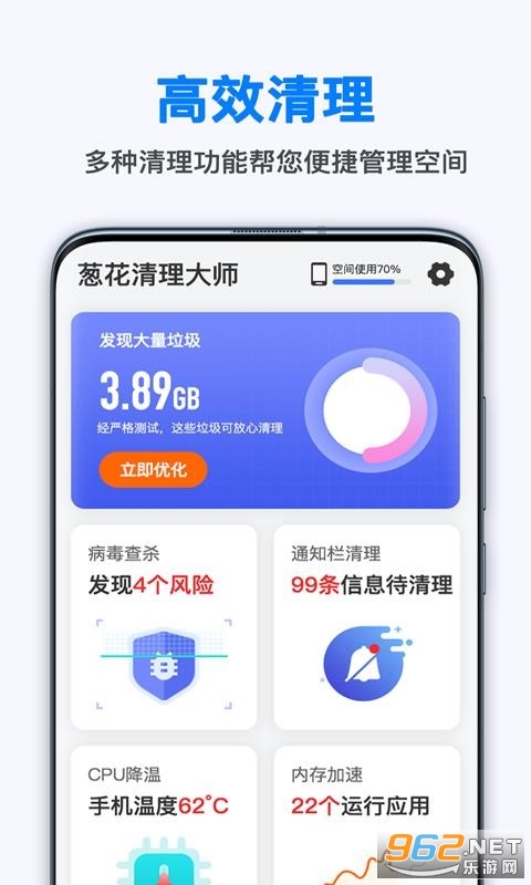 《葱花清理大师app》是一款全新上线的手机垃圾清理软件,用户可以使用这款软件对安卓手机进行手机垃圾的清理,还可以释放出更多的手机内存,让手机变得更加流畅。还可以使用户的手机进行降温处理,而且不需要任何费用,感兴趣欢迎来962下载吧!