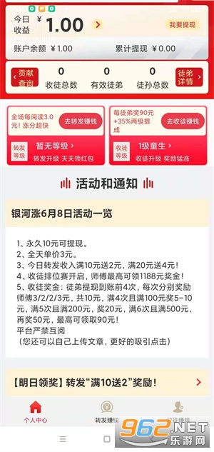 3、银河涨转发平台收益非常可观,而且没有门槛,基本上所有人都能在这里赚钱,超多的福利活动还能让你活动额外现金收益